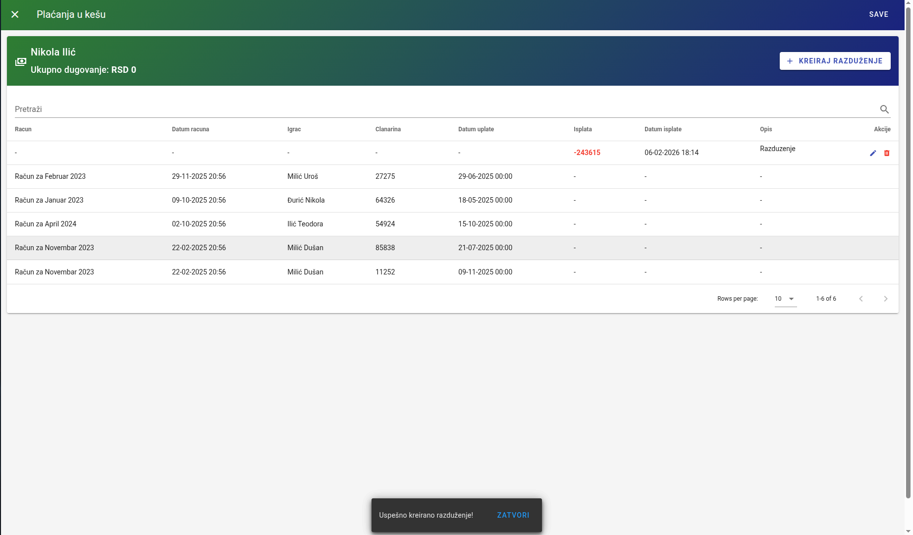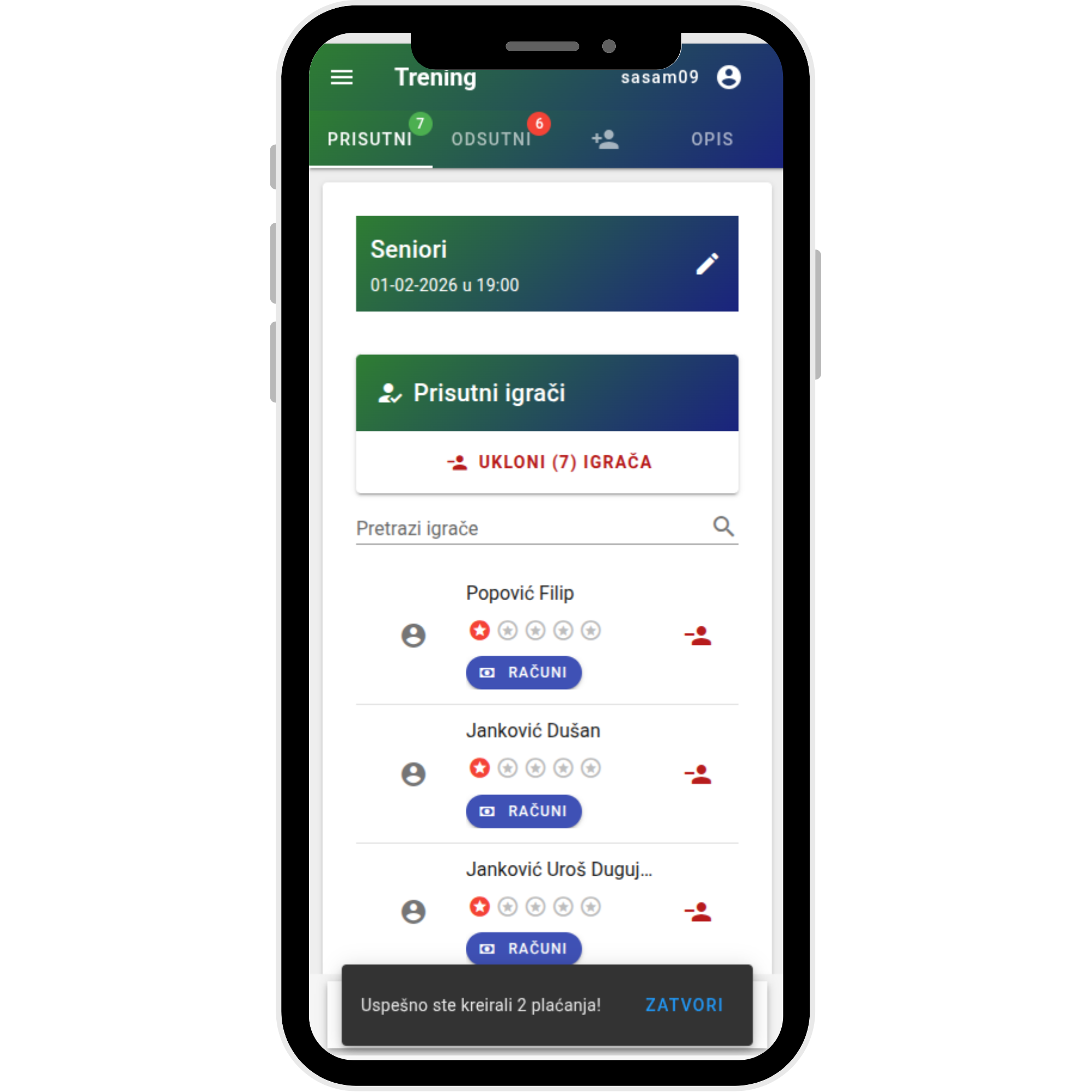 Treneri sada mogu direktno na treningu da naplate mesečnu članarinu u kešu. Svaka uplata se odmah unosi u sistem i automatski povezuje sa igračem.