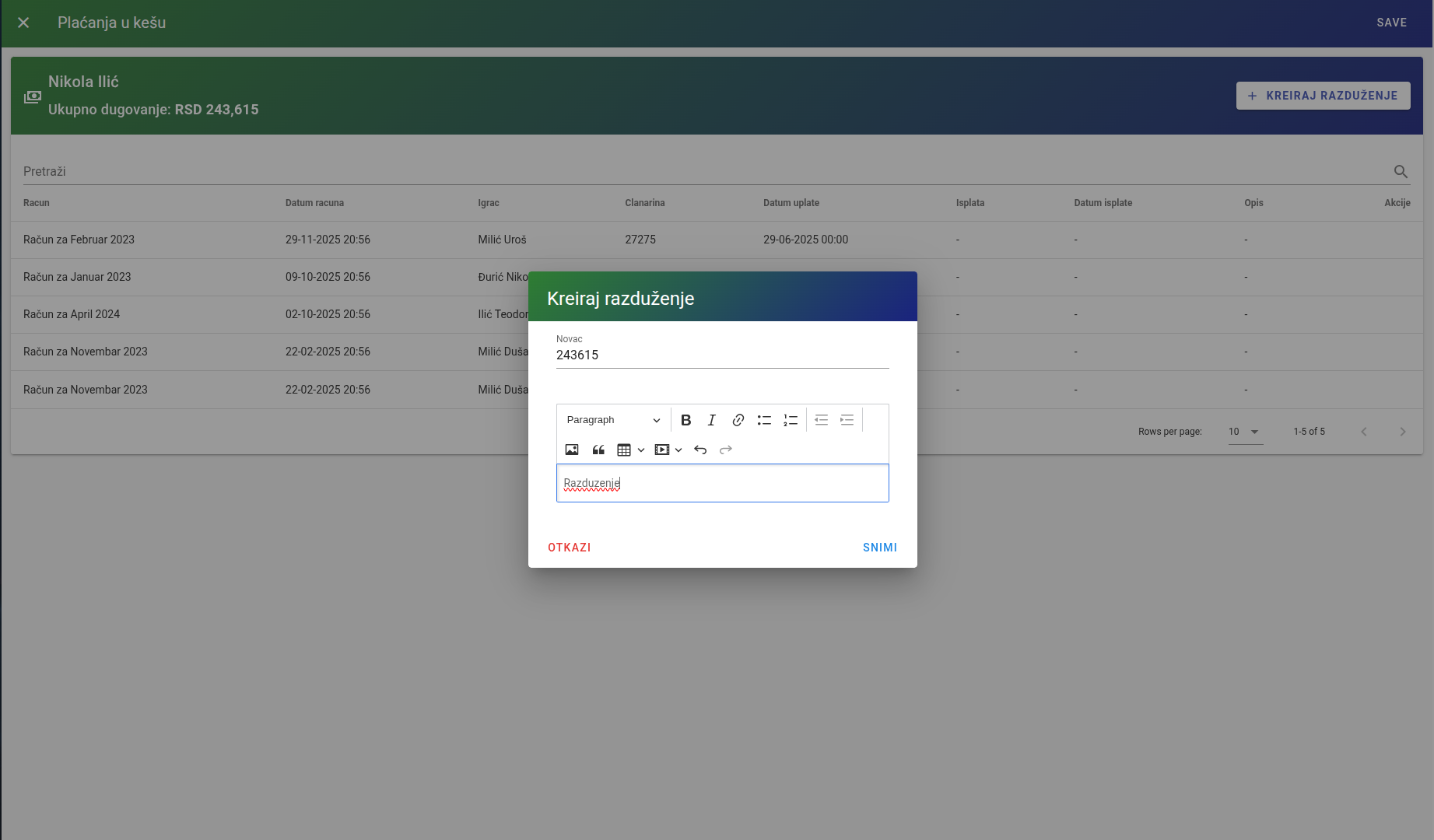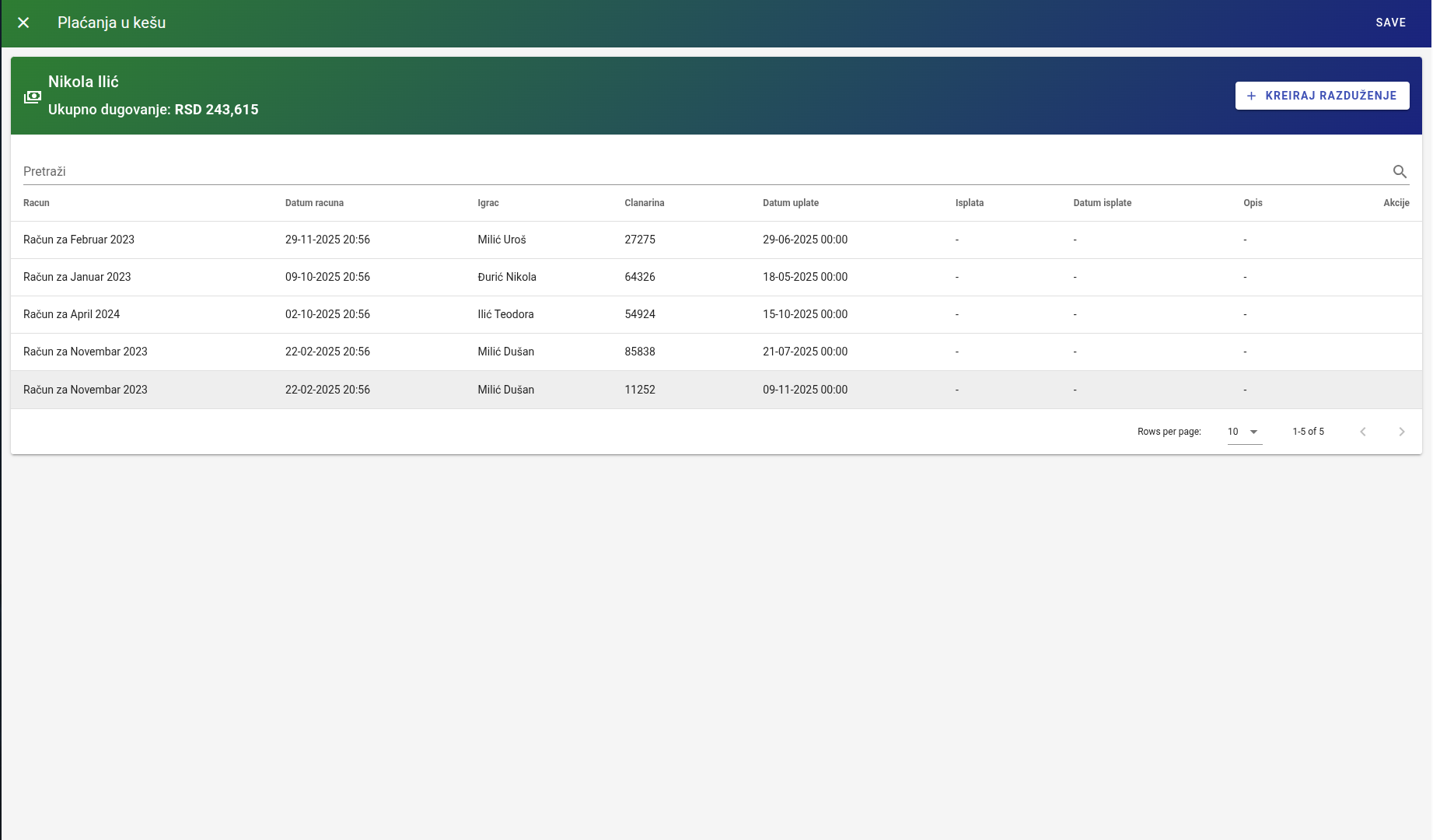 Ako igrač ima više neizmirenih mesečnih članarina, trener može jednim klikom naplatiti više računa odjednom.